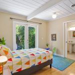 Upon entering the home’s main living area one is greeted with the open layout of the galley kitchen that extends to all four separate wings of the home. Vaulted tongue-and-groove wood ceilings along with the quintessential mid-century modern globe lighting strike that perfect balance between the classic Eichler style and the modern upgrades that are on display in the remodeled kitchen and fireplace surround, as well as the many updated dual paned windows. Adjacent to the living room is the family room with clerestory windows and an en-suite bathroom. A portion of the garage was converted to an additional bedroom and can easily serve as a small office or exercise room. The master suite along with the remaining 4 bedrooms and 3 bathrooms are all located on the northern wing of the home. A separate entrance in the rear allows for easy egress and privacy for extended family or guests. ADU options abound with this unique layout. (buyers to verify feasibility and requirements)