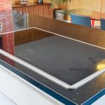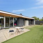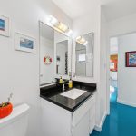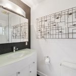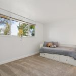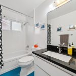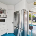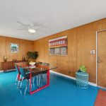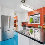 Inside, classic materials and thoughtful upgrades strike a perfect balance between authenticity and modern comfort. Epoxy-coated concrete floors, Luan & grooved wood paneling, and globe lighting maintain the period aesthetic, while radiant heating adds cozy practicality. The central kitchen blends vintage charm and modern convenience, featuring the original built-in Philco wall oven, induction cooktop, quartz countertops and carefully refinished cabinetry with soft-close hardware. Both bathrooms have been thoughtfully updated, and the home’s practical layout offers outdoor views from nearly every vantage point, enhancing its light-filled, connected feel.
